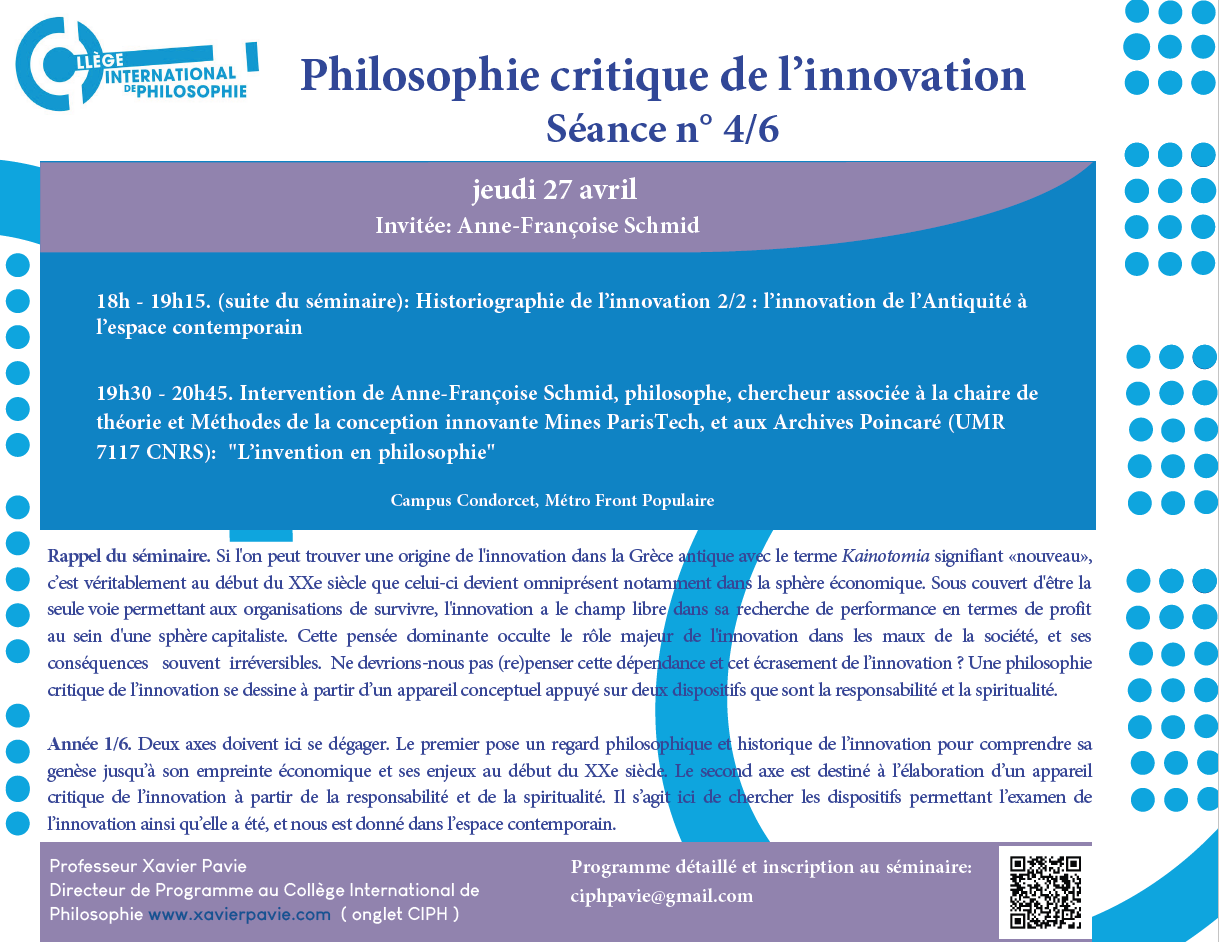 Le 27 avril prochain Anne-Françoise fera une conférence au Collège International de Philosophie sur le thème "L'invention en philosophie" où vous êtes évidemment les bienvenus. Ci-dessous l'annonce de la séance, tous les détails ici https://sites.google.com/site/xavierpavie/ciph?authuser=0